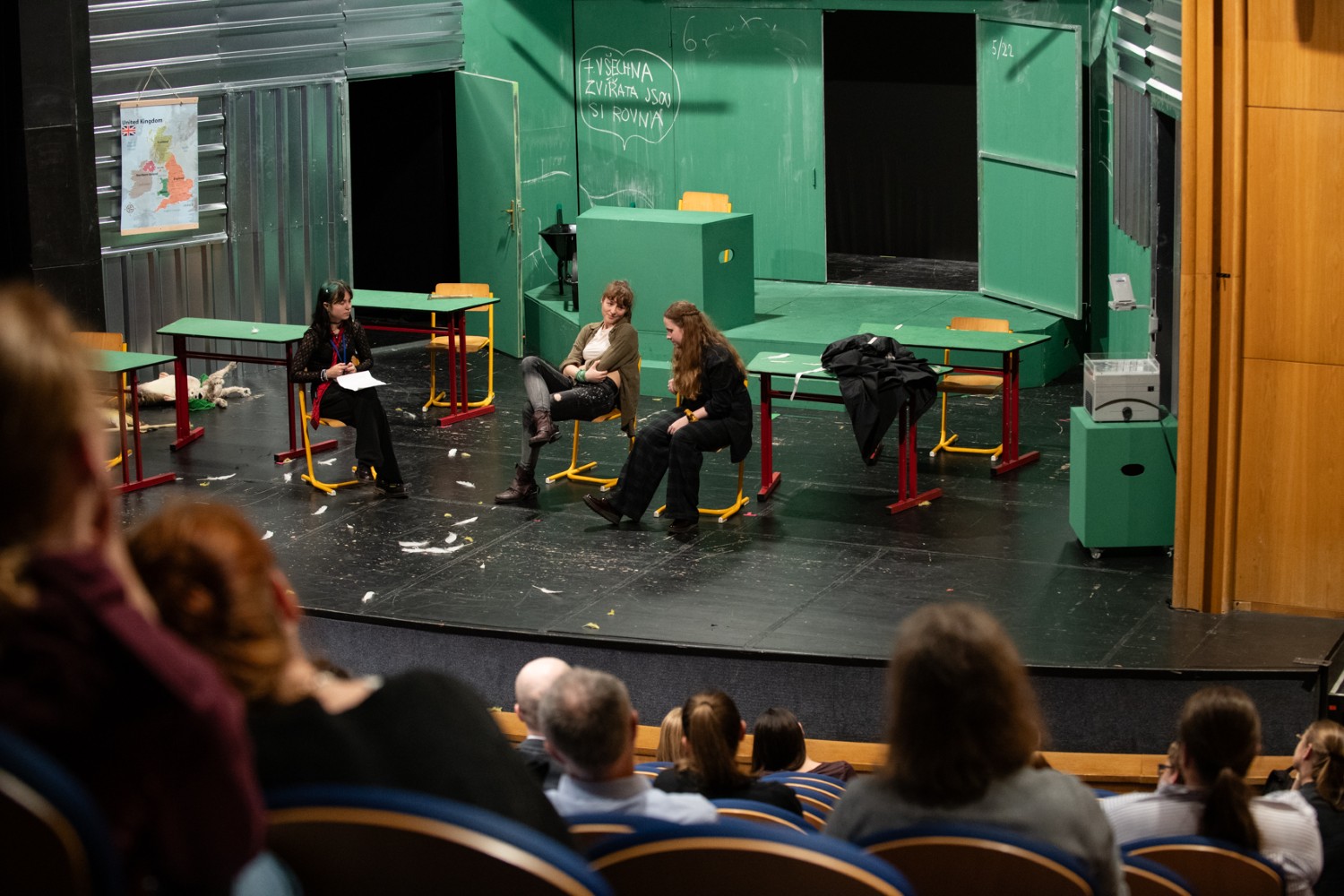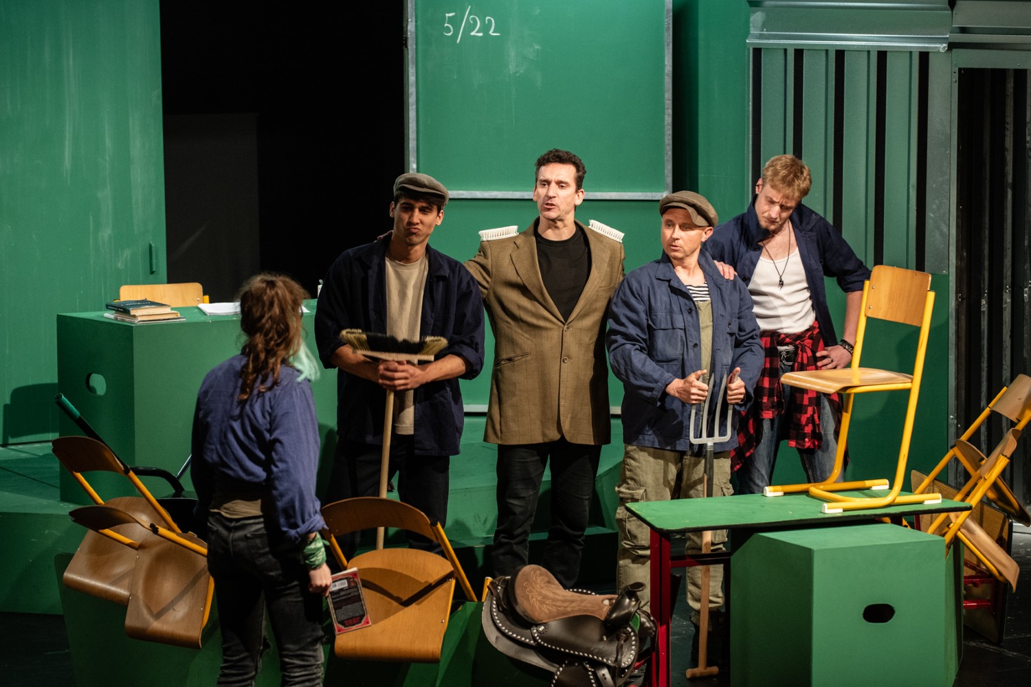 Vzhledem k tomu, že inscenace tematizuje také osobní zkušenosti studentů se šikanou, stává se pro ně touha inscenovat Farmu zvířat ještě naléhavější a osobnější. A to až do té míry, že mezi nimi znovu začnou vyvstávat konflikty – ať už kvůli původu (diskriminace skotského spolužáka Johna Argylla), zájmům (výsměch režisérským ambicím Nathaniela Berkshira) či genderu (soupeření o přízeň jediné dívky ve třídě – Clover Murrayové). Vzájemné střety mezi studenty odrážejí přetrvávající realitu hierarchického prostředí škol. Rovnocenný a konstruktivní dialog zůstává vzácností – dodnes ostatně nevíme, jak jej správně vést. Smyczkova inscenace to ukazuje například na scéně vzpoury studentů proti učiteli: namísto přímé komunikace se studenti raději zamknou ve třídě a bezcílně protestují, aniž by se pokusili pedagogovi otevřeně říci, co je vlastně trápí. Inscenace nabízí obraz současnosti, v níž se často uchylujeme k absurdnímu řešení situací.